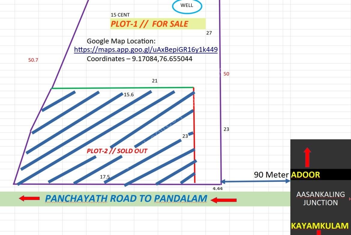 15 Cent original land (Purayidam), flat level, with a good well with plenty of good water (never dry), at Aasankalingu Junction in Kayamkulam – Punaloor Highway road. This plot is just 90 meter away from Highway towards Panchayath road going to Pandalam.